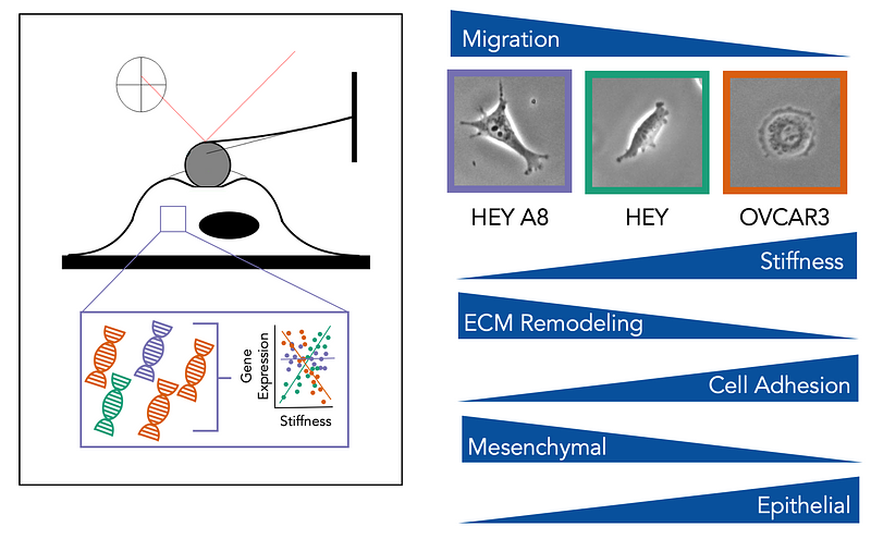 I developed a novel method to correlate single-cell mechanical properties (such as stiffness and viscosity) with gene expression, enabling direct analysis of how mechanotype relates to genotype. Using this approach, I identified correlations between cell stiffness and genes implicated in extracellular matrix remodeling (TGM2), epithelial-to-mesenchymal transition (VIM, ZEB1, CDH1), nuclear structure (LMNA), and metastasis suppressors (TIMP3). I also discovered a set of regulatory “control node” genes – including miR183 and CD82 – whose perturbation can predictably alter both cell mechanics and invasive potential. These findings represent a critical step toward uncovering the molecular mechanisms governing cell mechanics and how they can be targeted to modulate cancer cell behavior.